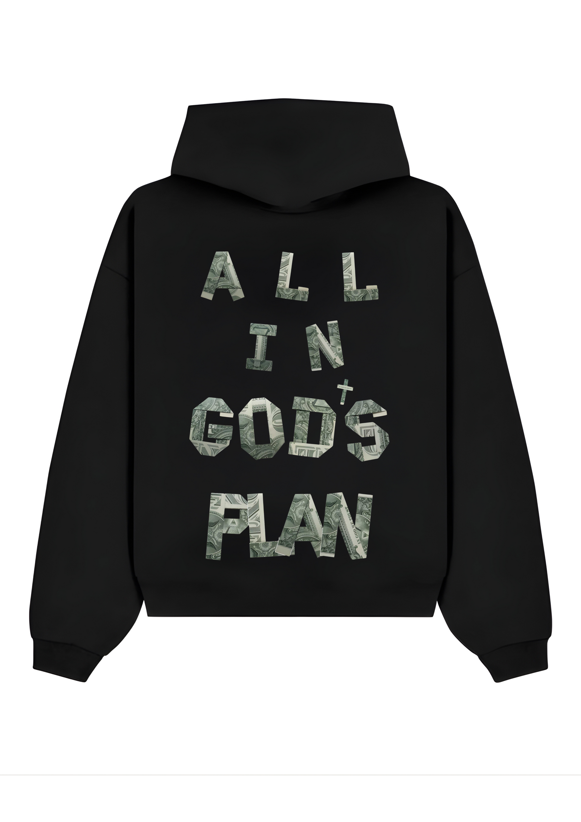 Walk by faith, not by sight. The "Faith Over Fear" Hoodie is more than just streetwear; it’s a statement of trust in the process. Featuring a bold "OG" chest logo and a massive "ALL IN GOD'S PLAN" back graphic, the lettering is uniquely filled with a dollar-bill texture—symbolizing the balance between the hustle for success and the trust in divine timing.
