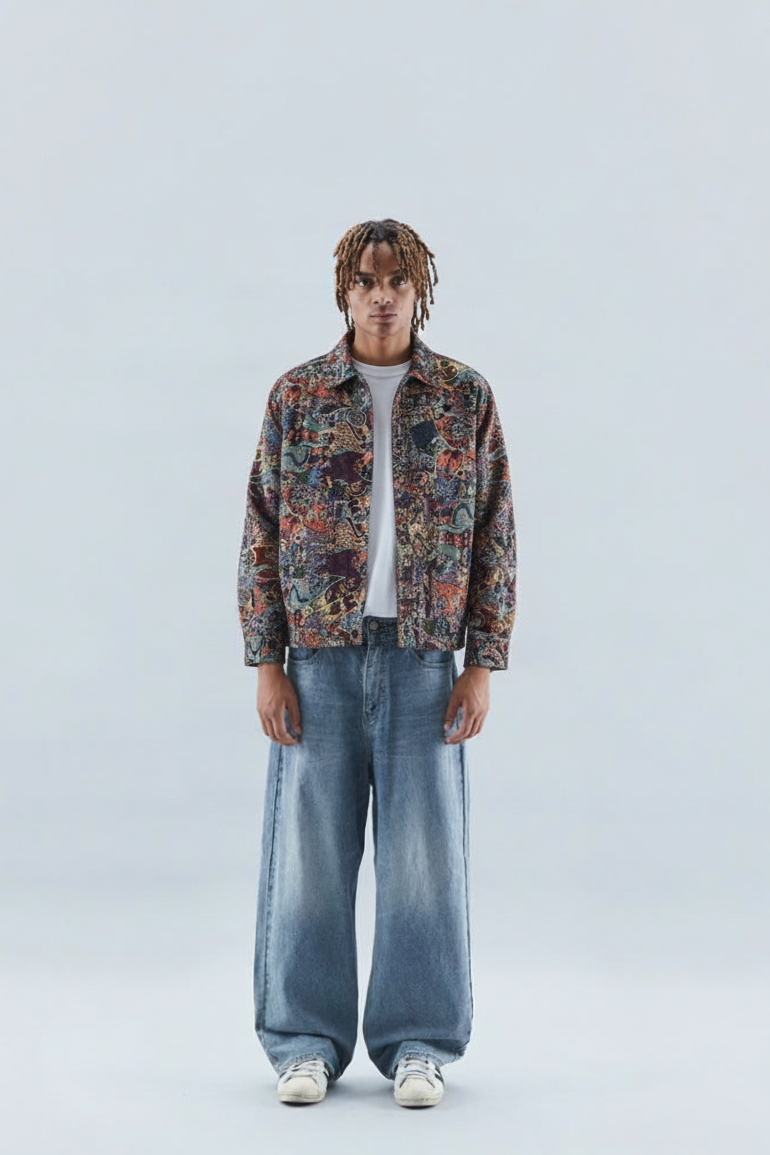 Structure meets the street. The Heritage Hustle jacket is a masterclass in texture and silhouette. Eschewing the traditional hood for a sharper, more refined neckline, this jacket is engineered from 400 GSM jacquard fabric. The intricate weave provides a complex, tactile surface that feels as substantial as it looks.