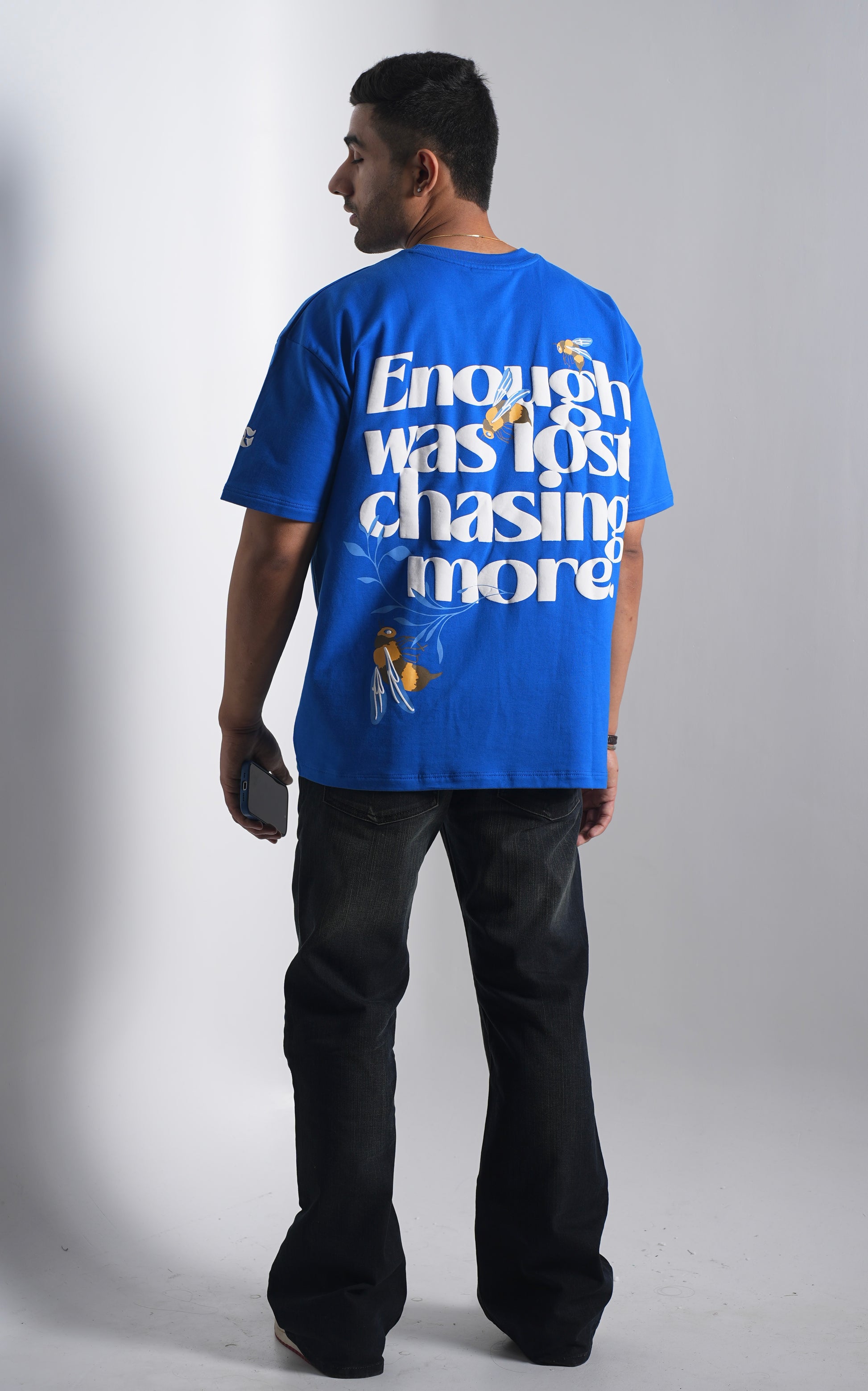 The bold design features 100% puff and screen printing for a textured, high-impact graphic. The artwork, featuring intricate details of a bird and nature-inspired elements, reflects a powerful message: "Enough Was Lost Chasing More." This piece encourages you to focus on what truly matters and embrace simplicity over excess.