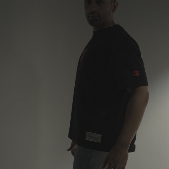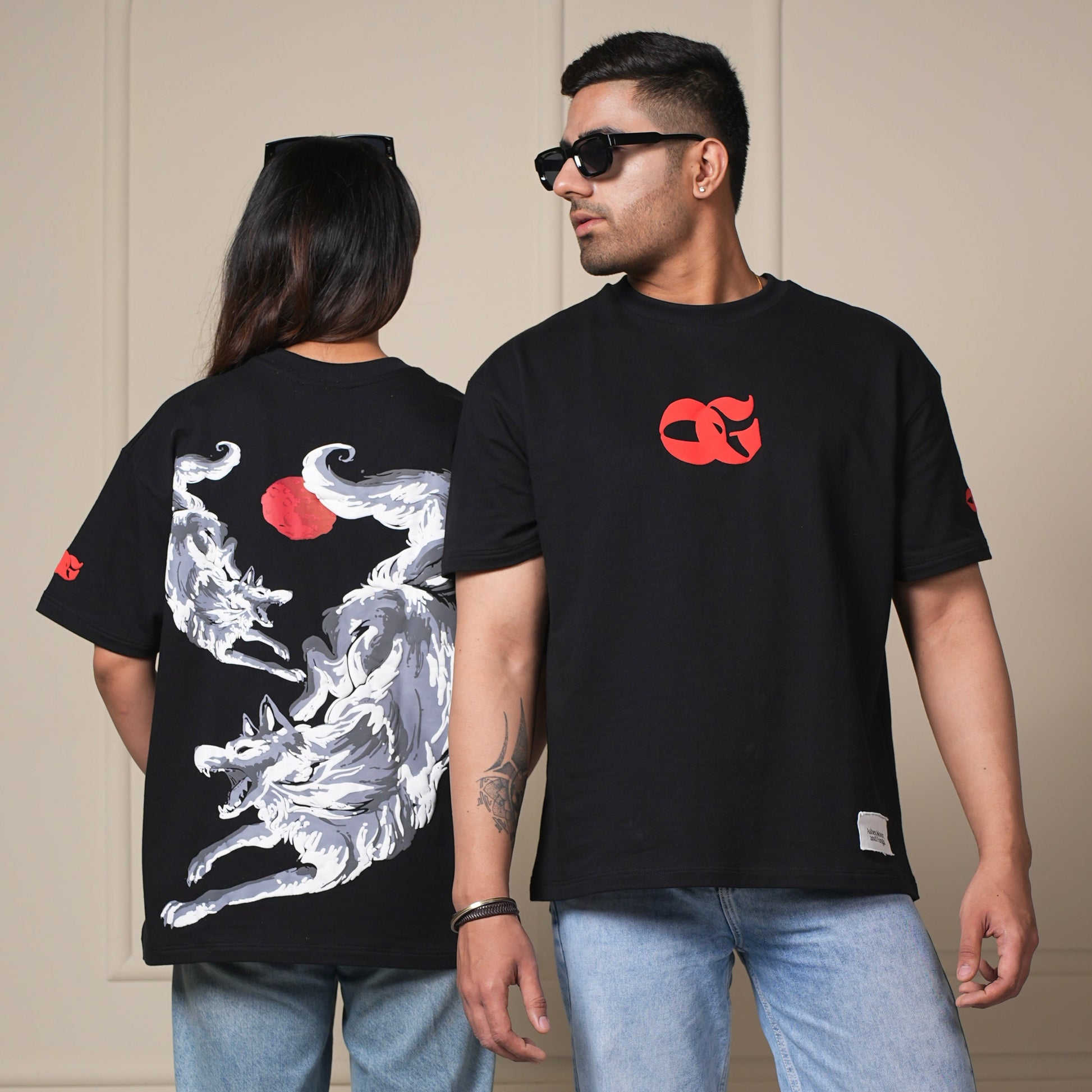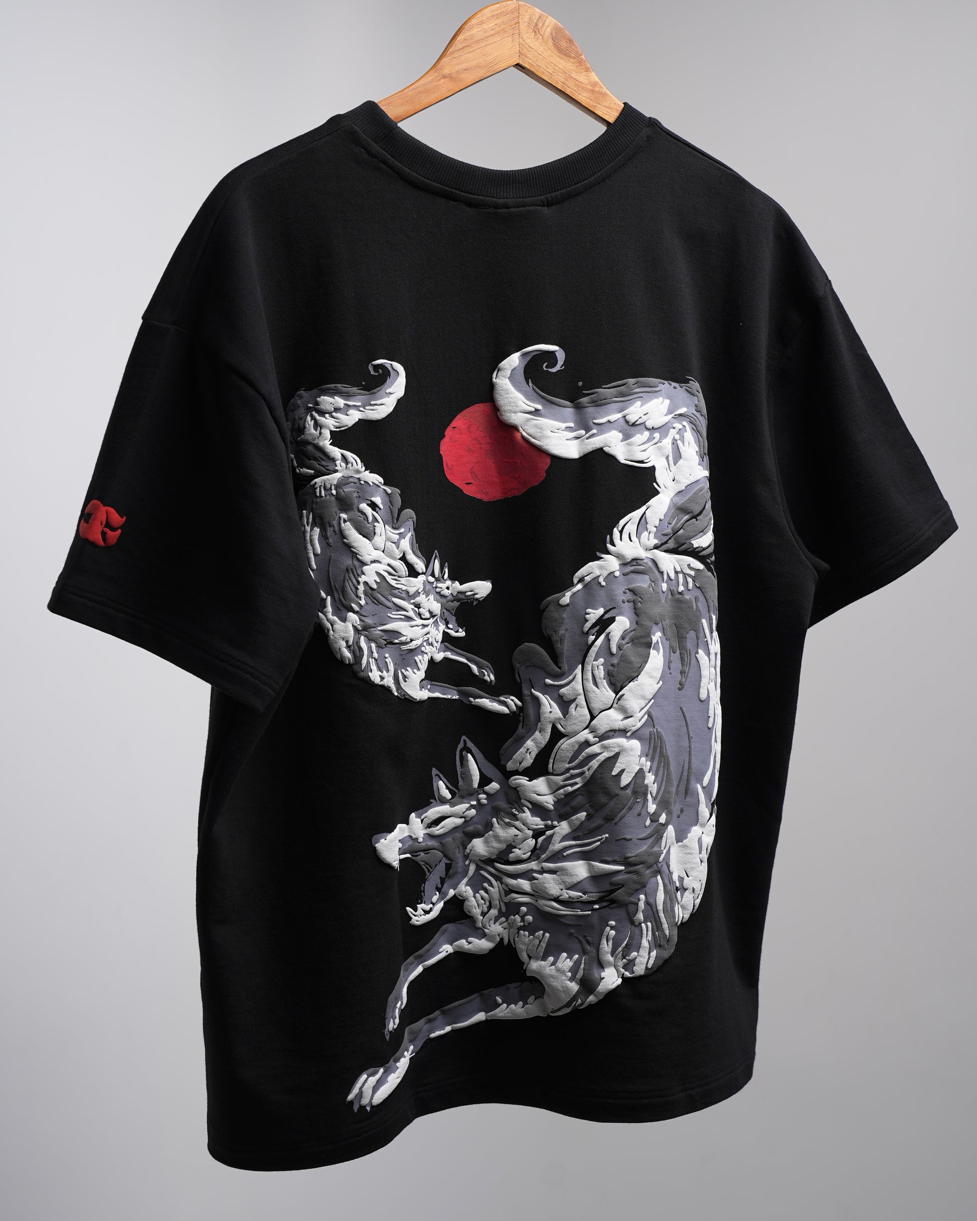 This piece is a true work of art, featuring 100% puff and screen printing that brings the design to life. The graphic showcases two wolves, beautifully rendered in shades of gray and white, set against a striking red moon. It symbolizes the eternal dance of power, wisdom, and survival—where the ashes of the past give rise to the strength of the present. The wolves represent the fierce determination and instinctual drive we all share, forever chasing the horizon under the moon's watchful gaze.